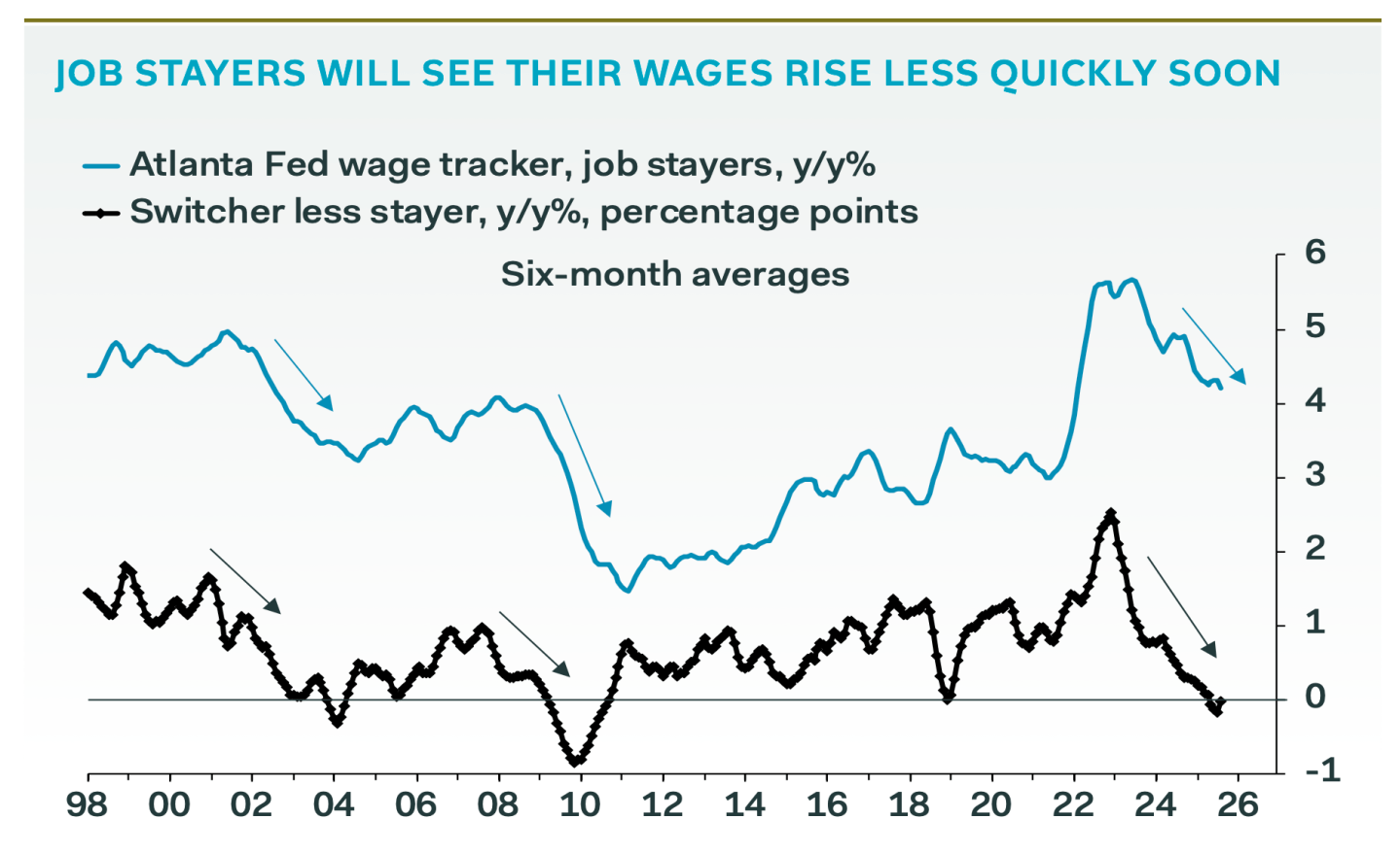 Four of five regional Fed surveys show the number of companies saying they will increase wages has “slumped” recently, Tombs and Allen say. Wage growth will slow to 3% by early 2026, data from the Atlanta Fed suggests.