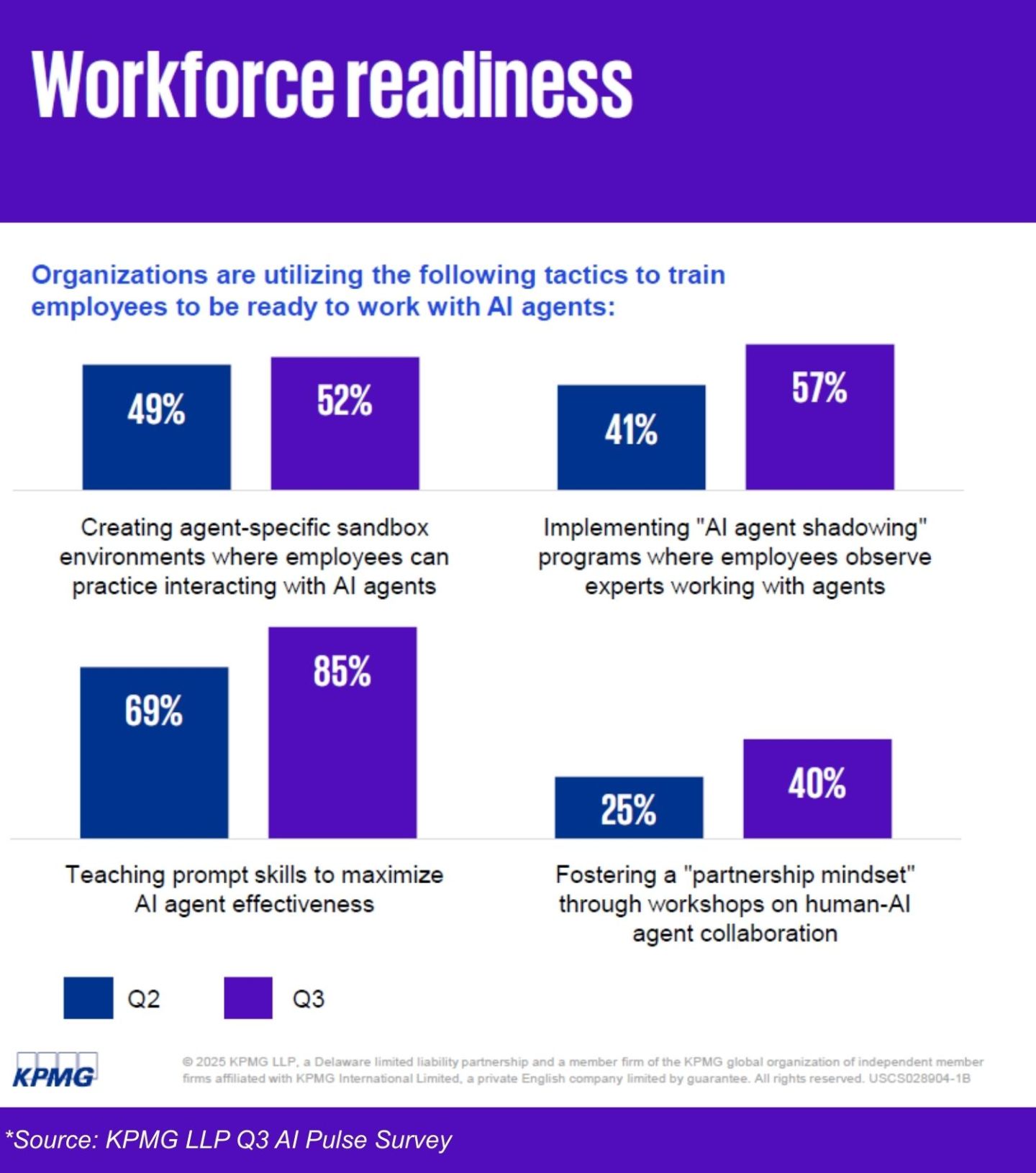Larger organizations—and their workers—are increasingly embracing AI agents. 42% of companies have launched at least some AI agents, nearly quadrupling the deployment from two quarters ago, according to KPMG’s Q3 AI pulse survey of 130 U.S.-based C-suite and business leaders at firms with annual revenue of $1 billion or more. The most active use of AI agents are in IT/technology (95%), operations (89%), and risk management (66%), while marketing and sales (18%) and human resources (2%) lag far behind.