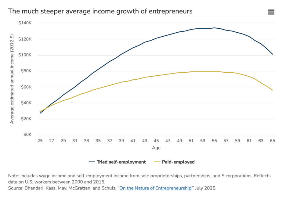 But those workers soon switched places, and by age 30 entrepreneurs made $55,000 versus $45,000 for paycheck workers, or 22% more.