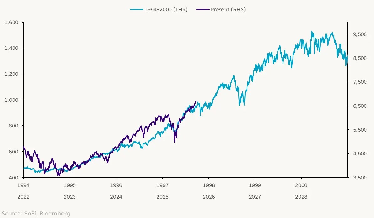 They are not alone. Cleveland Fed President Beth Hammack told CNBC this morning that she doesn’t see the market pricing in a “material drawback” anytime soon. And SoFi’s head of investment strategy, Liz Thomas, recently published a fascinating comparison between today’s S&P 500 and that of the late 1990s, immediately prior to the end of the dotcom bubble. The two markets are spookily similar to each other, she says, but “the clearest takeaway here is if the two cycles do end up resembling each other, we’ve still got some runway before this market rally loses steam.”