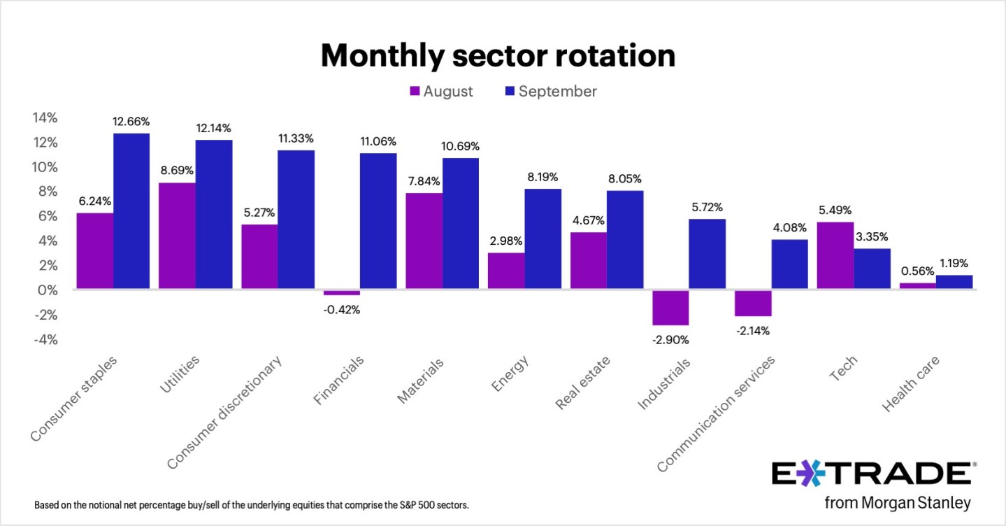 E*TRADE from Morgan Stanley has released its monthly analysis. "In the U.S. stock market’s strongest September since 2010, E*TRADE from Morgan Stanley clients were net buyers in all 11 S&P 500 sectors," according to Chris Larkin, managing director of trading and investing.
