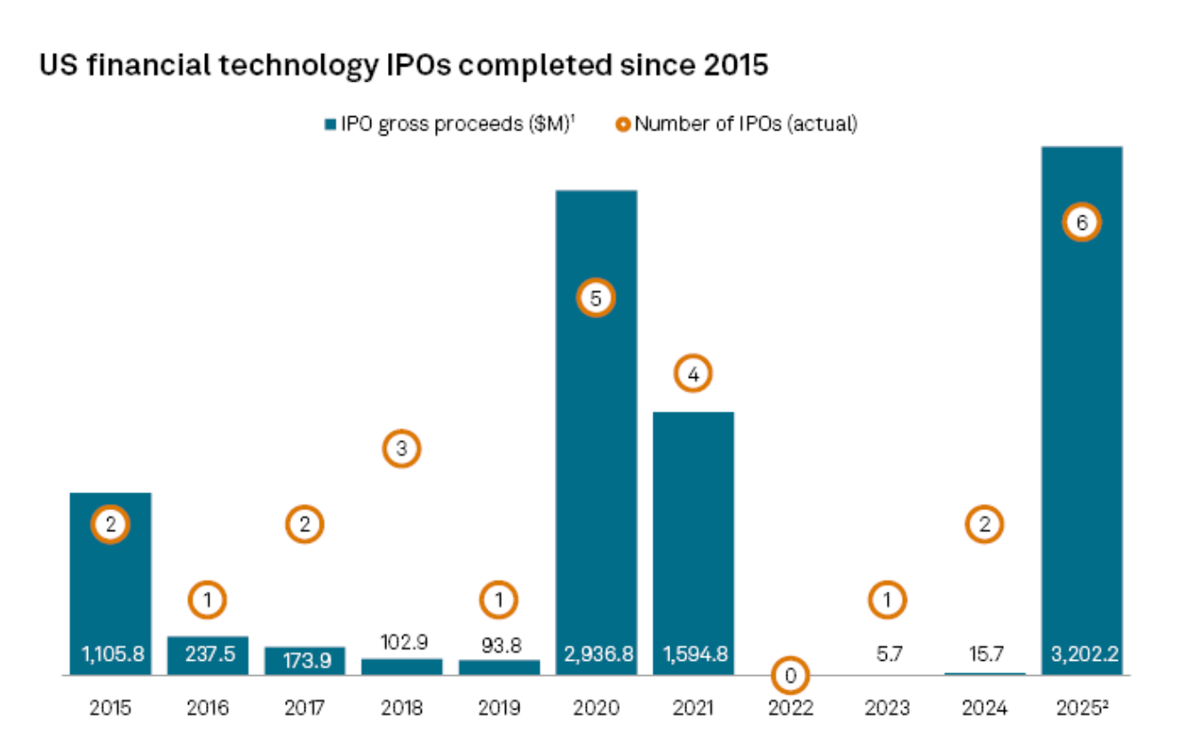 After a slow period for fintech initial public offerings, the IPO market rebounded in 2025, with six fintech companies going public so far this year, according to data from S&P Global Market Intelligence.