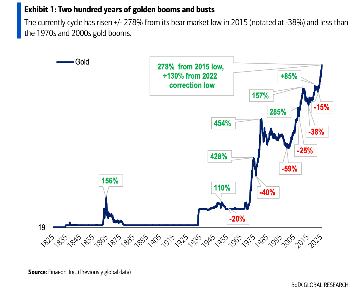 Since hitting lows in 2015, he noted, gold rallied about 85% into 2020, corrected roughly 15% into 2022 and then rallied another 130%. While caveating that further upside over the next two years is definitely possible and this boom is smaller than the booms of the 1970s and 2000s, Ciana sees a “rhyme” with several “midway corrections” in 2020–22, 2007–08, and 1975–76.
