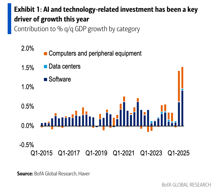 Bhave’s team is generally more bullish. While allowing that risks aren’t off the table in the medium term, they argue that, for now at least, AI appears to be a “net positive” for growth. Just look at the GDP figures from the first half, which surprised even BofA’s relatively optimistic expectations. The rebound to an annualized rate of 1.6% is “particularly resilient considering the missing imports problem” in the first quarter owing to the Trump tariff shock, which “blurs the picture” a bit. Investment in AI is just a huge force driving the economy forward, they say.