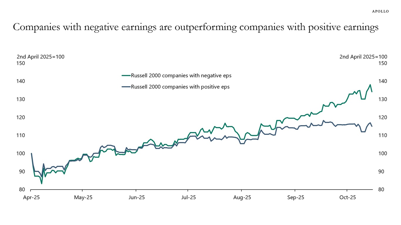 Yet on Wall Street, analysts are increasingly asking whether tech stocks are in a bubble, and one crucial stat keeps coming up: About 40% of the companies in the small-cap Russell 2000 index have no earnings or negative earnings, according to Apollo Global Management chief economist Torsten Slok. “Something remarkable is going on in the equity market. Stock prices of companies with negative earnings have in recent months outperformed stock prices of companies with positive earnings,” he said on his blog.