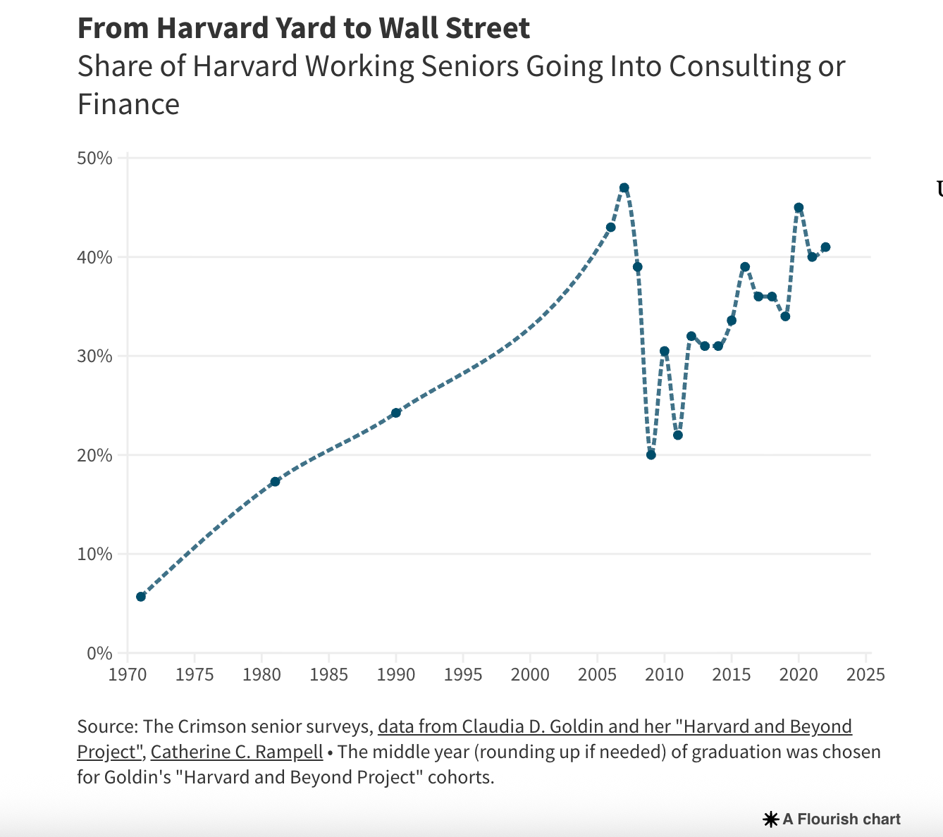 Career paths for the elite have indeed consolidated over the last half-century. In the 1970s, one in twenty Harvard graduates went into careers of the likes of finance or consulting. Twenty years later, that jumped to one in four. Last year, half of Harvard graduates took jobs in finance, consulting or Big Tech. Salaries have similarly soared: data from the senior exit survey for the Class of 2024 shows 40% of employed graduates accepted first-year salaries exceeding US $110,000, and among those entering consulting or investment banking nearly three-quarters crossed that threshold.