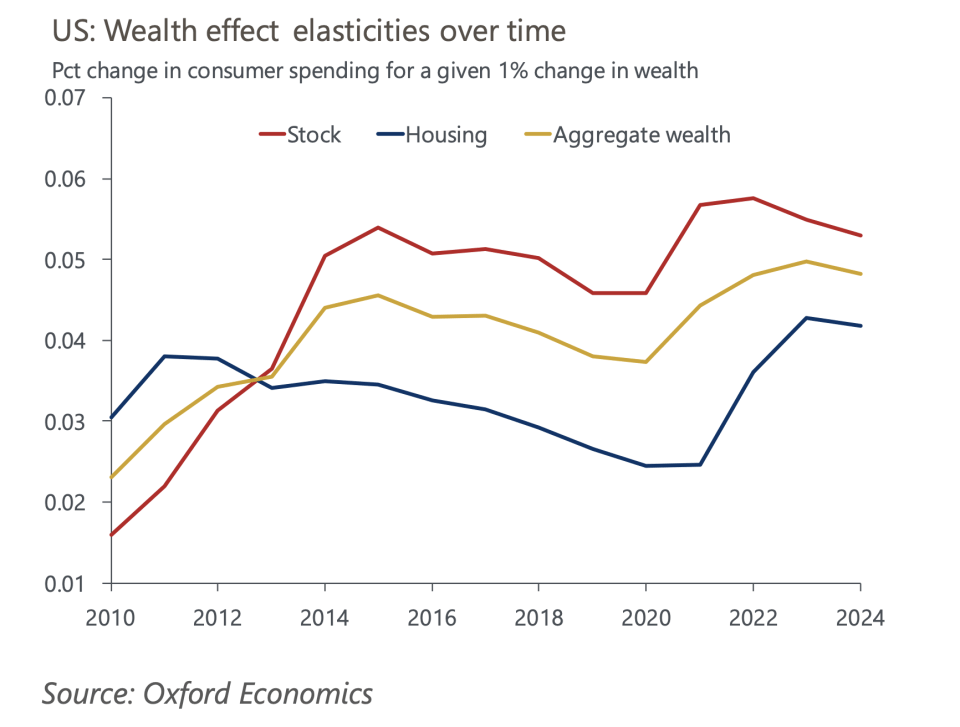 Today, every 1% increase in stock wealth translates to a 0.05% uptick in consumer spending, according to a note last week from Oxford Economics lead U.S. economist Bernard Yaros.
