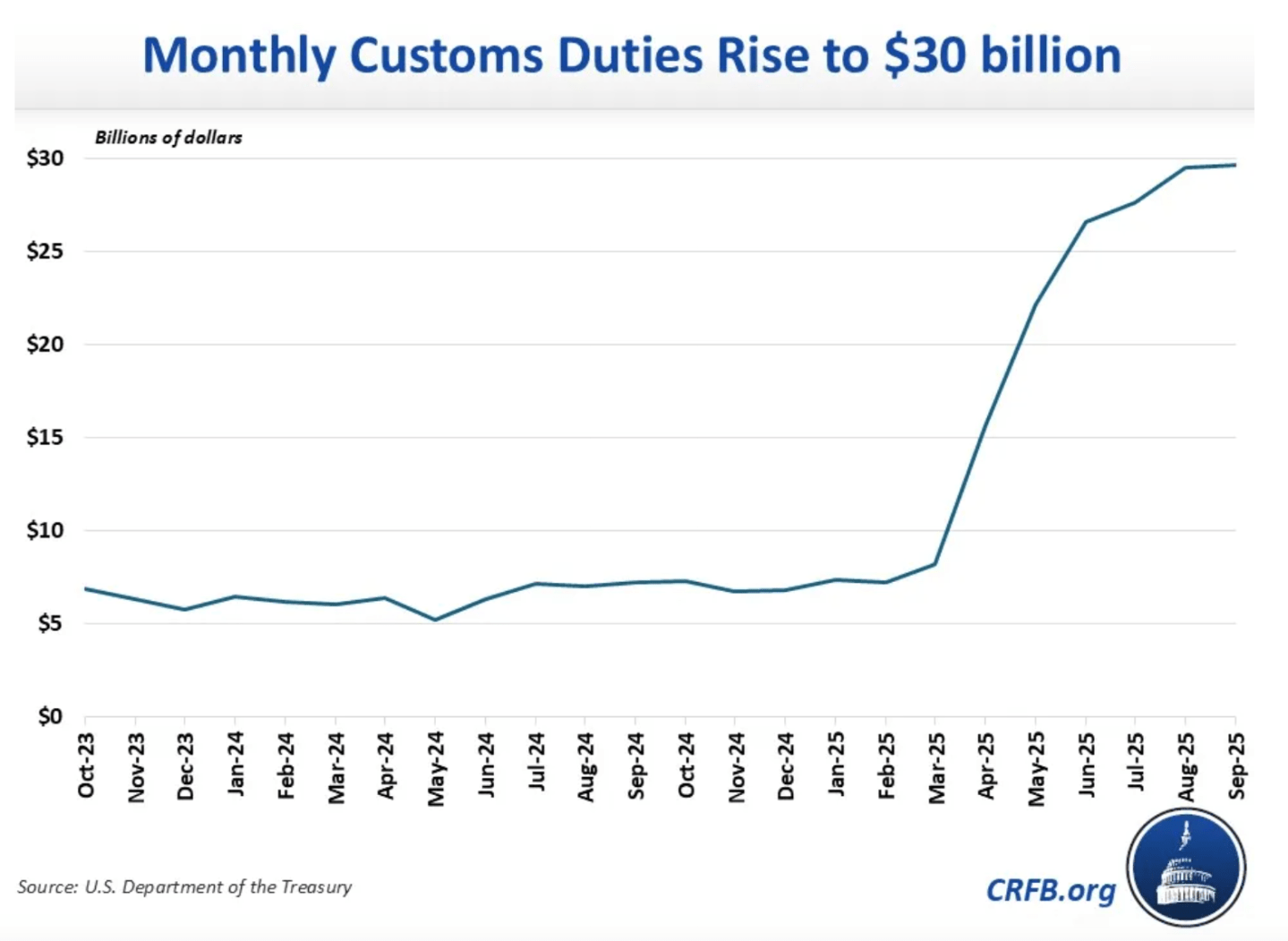 The CRFB did not comment in this analysis on exactly who is paying for the tariffs, a subject that is much debated and somewhat opaque given how tariffs are calculated. Federal Reserve governor Chris Waller told CNBC in October that the data he sees suggests that wealthier Americans are bearing a much heavier load from tariff pass-throughs, while Fortune’s Shawn Tully and Steve “the Money Doctor” Hanke wrote in August that the tariffs are really a sales tax in disguise.