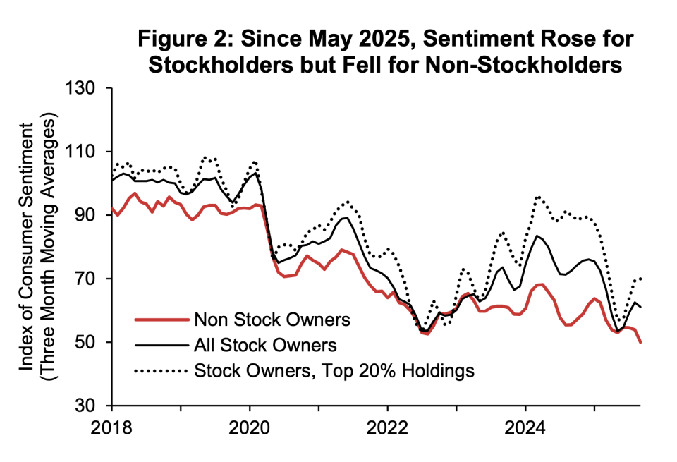 Stock ownership has highlighted a divergence in consumer sentiment in recent months: investors are turning more upbeat while non-investors have turned more pessimistic, according to University of Michigan data from October. And participants with the top 20% of stock holdings are especially optimistic.