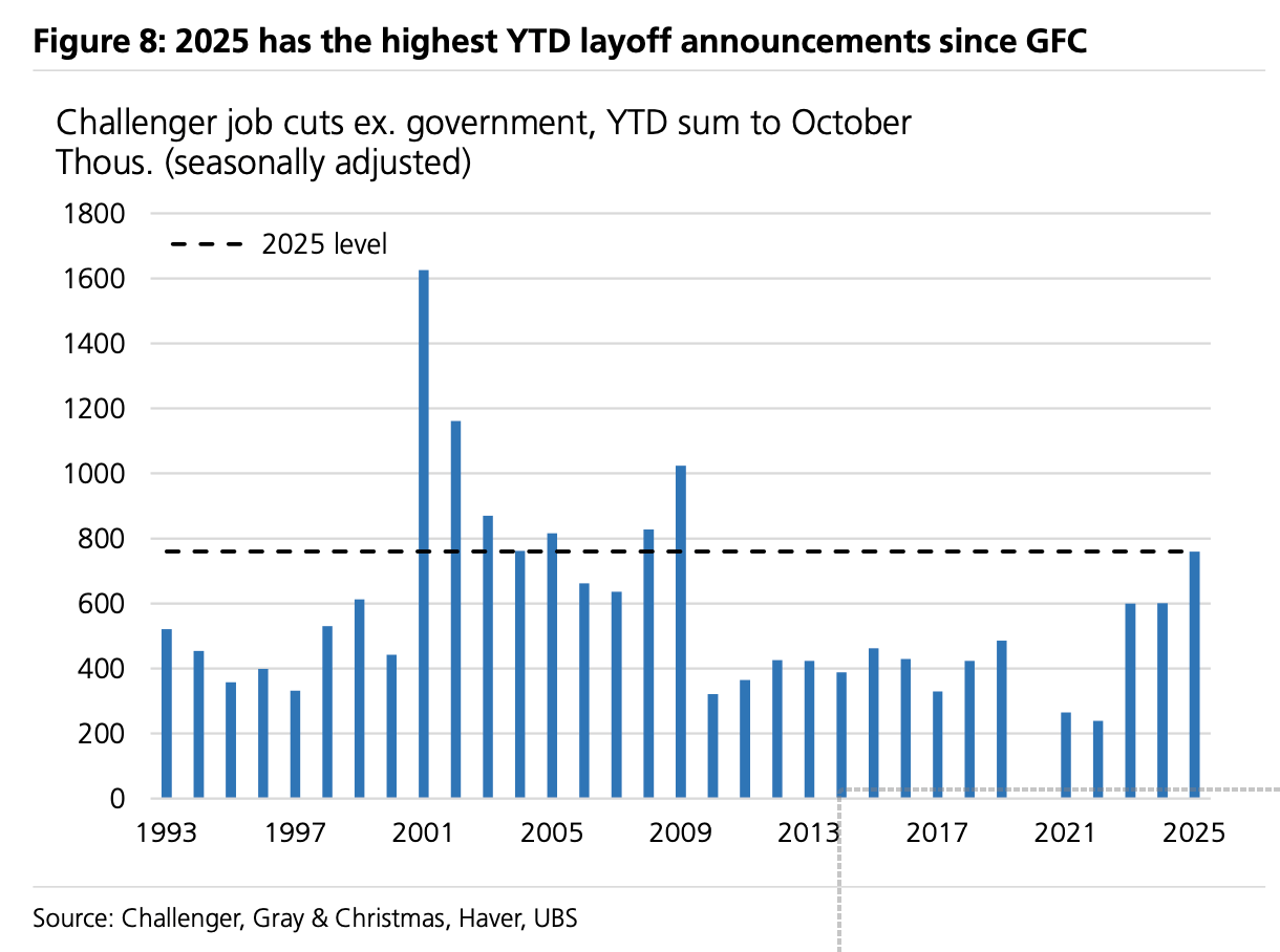 Indeed, cuts have accelerated sharply. October saw 157,000 layoffs announced by corporations, per industry standard Challenger, Gray & Christmas, the highest monthly total since July 2020. Technology and warehousing were hit especially hard, with cuts also linked to automation and artificial intelligence.