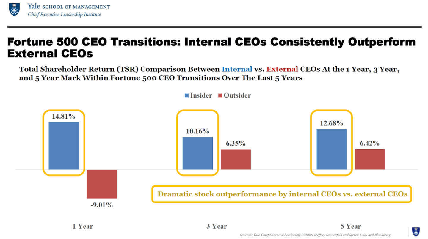 We analyzed all CEO transitions taking place in the Fortune 500, and we found that of the 61 CEO transitions which took place over the last year, the 39 CEOs who were elevated from within, have generated an average TSR of 14.81% on an annualized basis, while the 22 CEOs who were selected from the outside have generated an average TSR of -9.01% on an annualized basis.
