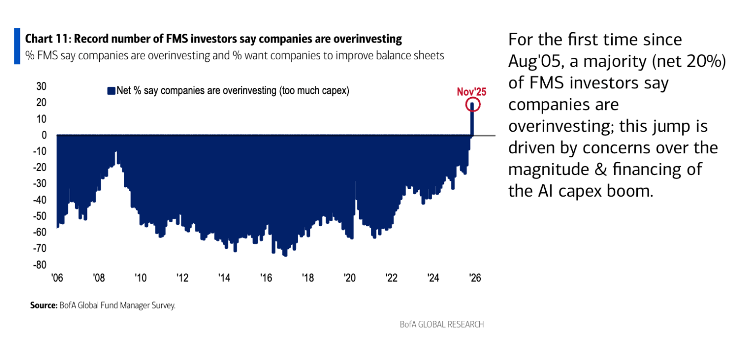 The survey of 202 panelists managing $550 billion in assets under management (AUM) revealed a net 20% of FMS investors now believe companies are deploying capital too aggressively—a sentiment not observed since August 2005. This dramatic shift is explicitly linked to the “magnitude & financing of the AI capex boom,” according to Bank of America Research.