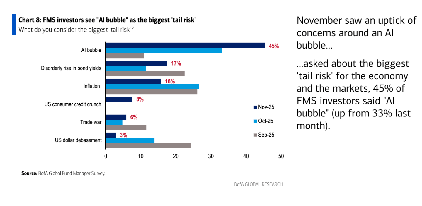 The anxiety surrounding corporate spending habits is inseparable from prevailing bubble fears in the technology sector. The BofA FMS identified the “AI bubble” as the #1 biggest “tail risk” for the economy and markets, cited by 45% of investors. This represented a big jump in concern, up from 33%, from the prior month.
