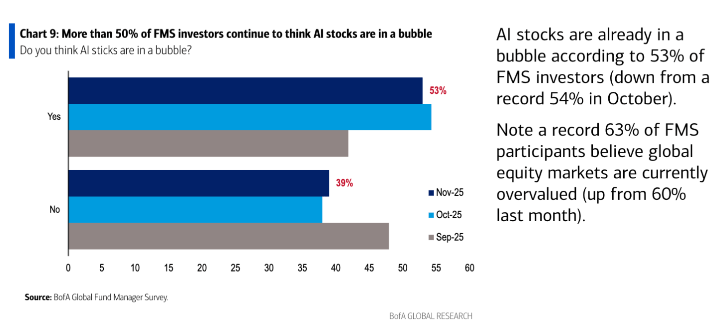 More than half of the surveyed investors, 53%, already believe AI stocks are in a bubble (a result actually down 1% from the previous month). This concentrated risk is further evidenced by the fact “Long Magnificent 7” remains the No. 1 most crowded trade, selected by 54% of FMS participants. This means a large portion of the market is heavily invested in the very companies driving the high capital expenditure managers are now flagging as excessive.