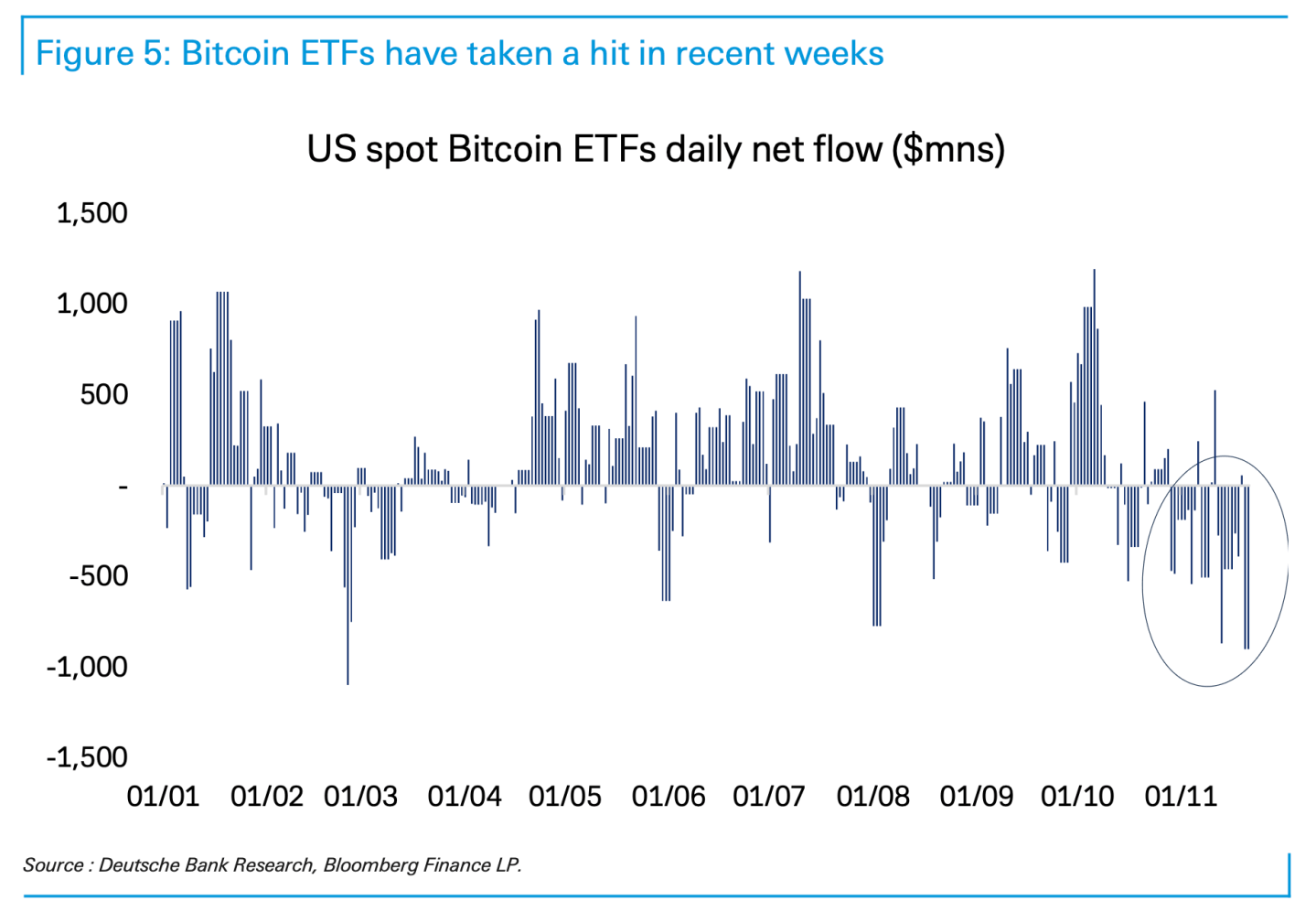 First is that the Bitcoin ETF trade has seen a sharp unwinding over the past few days. When traditional finance platforms launched Bitcoin ETFs, there was a huge influx of interest, as retail investors (who previously may not have felt confident enough to create a crypto wallet) decided to enter the market. But with the price of Bitcoin plunging over the past 30 days, hundreds of millions of dollars have poured out of those ETFs, as this chart from Deutsche Bank shows: