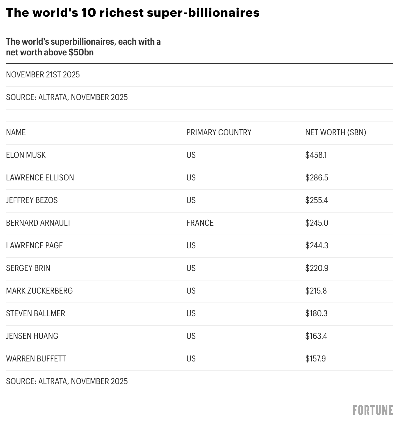 There are currently 29 “superbillionaires” out there boasting fortunes of over $50 billion—and a majority of them live in the U.S., according to a Nov. 21 analysis from data intelligence firm Altrata, shared exclusively with Fortune.