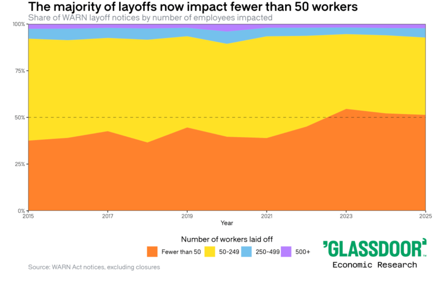 Glassdoor’s 2026 Worklife Trends analysis describes a structural shift away from rare, large-scale reductions toward frequent layoffs affecting fewer than 50 workers at a time. These “forever layoffs” now account for a majority of cuts in some data, with the share of small layoffs rising from well under half in the mid-2010s to more than half by 2025. The new model allows leaders to continuously adjust headcount in response to markets and AI adoption without the reputational and morale shock of a single blockbuster layoff event.