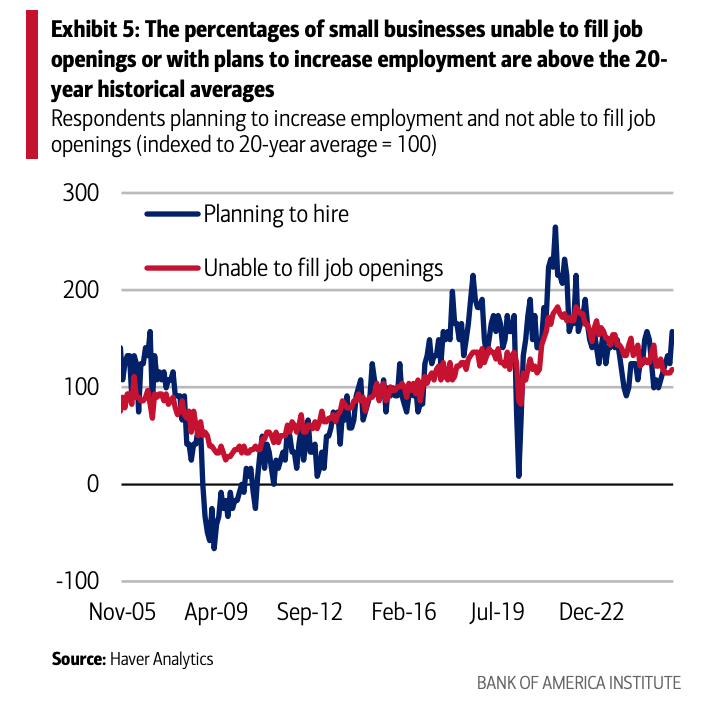 However, the labor picture remains nuanced. While general hiring has cooled, sectors facing chronic labor shortages, such as construction and restaurants, actually increased payroll growth as they scrambled to fill open positions. Still, BofA notes that small businesses are generally both planning to increase employment and unable to fill job openings at higher rates than the average of the last two decades. Speaking to Fortune‘s Eva Roytburg earlier this week on the revelation of disappointing economywide jobs data, Moody’s chief economist Mark Zandi said “there’s just no forward motion,” with the labor market “stuck in the mud.”