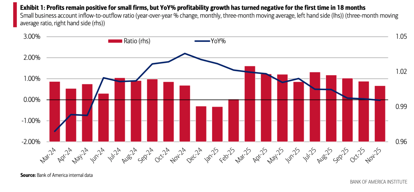 For the first time in a year-and-a-half, the growth engine of America’s small business economy has sputtered, with profitability growth slipping into negative territory in November. According to the December edition of the Small Business Checkpoint from the Bank of America Institute, rising costs associated with tariffs and inflation are forcing Main Street merchants to raise prices at historic rates, even as the holiday shopping season offers a critical lifeline.
