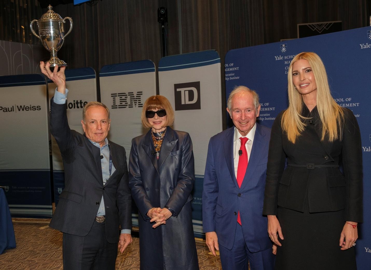 Bernard Arnault on video at the Yale CEO Leadership Institute, with seated from left to right: Anna Wintour/Conde Nast, Michael Burke/LVMH, Sara Eisen/CNBC, Jeffrey Sonnenfeld/Yale, Ivanka Trump/entrepreneur, Stephen Schwarzman/Blackstone.Yale Chief Executive Leadership Institute/CNBC (Photographer: Donovan Marks
