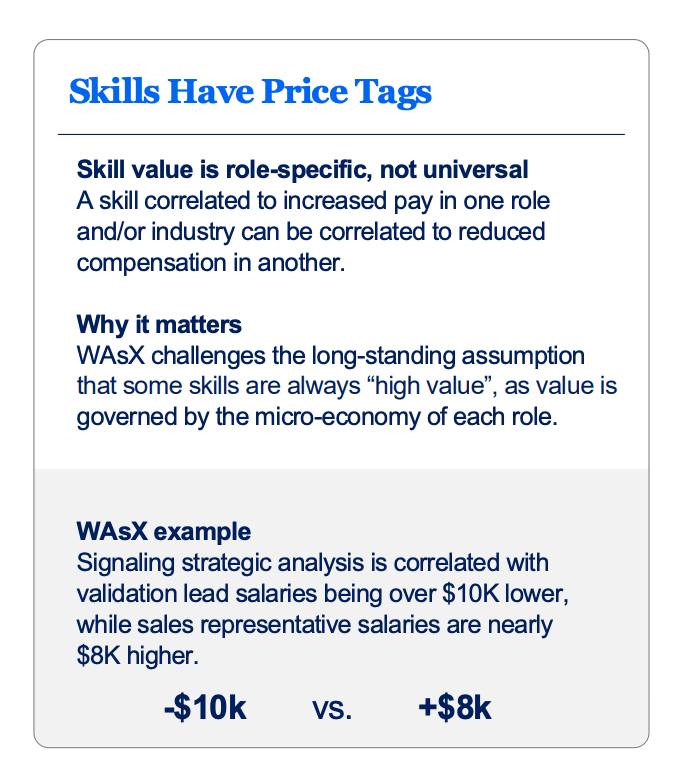One of the most revealing findings of the WAsX is that skill value is role-specific, not universal, with a capability that boosts pay in one industry, for instance, actually lowering it in another. For example, the index found that signaling “strategic analysis” skills is correlated with an $8,000 salary increase for sales representatives but a $10,000 salary decrease for technical validation leads. In highly technical roles, the market prioritizes domain depth—such as liposome technologies or catalytic reactor techniques—over general management strategy.