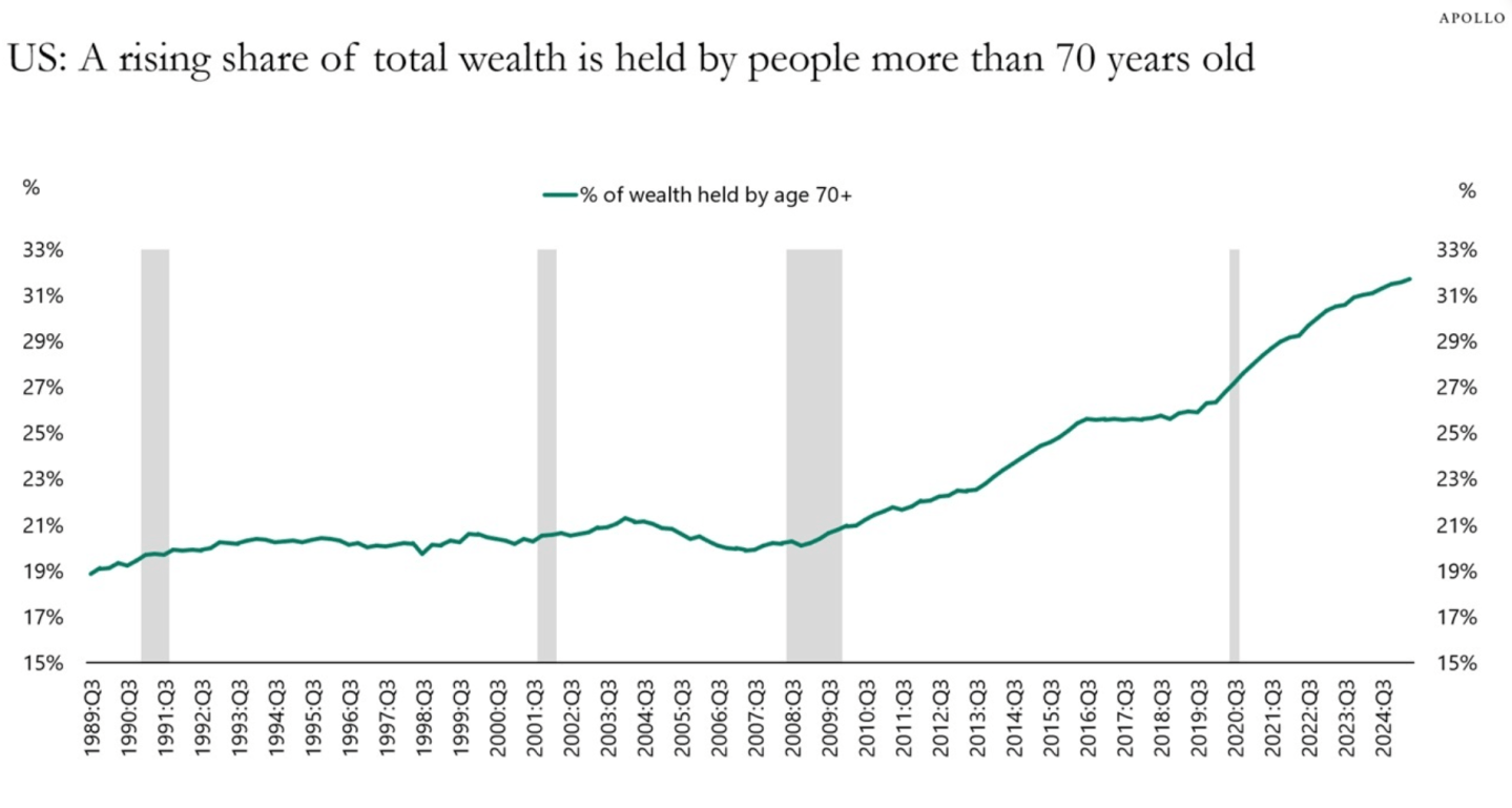 To that point, Apollo’s Slok noted in December that a record-high share of total wealth in the household sector is owned by people over 70 years old, no doubt juiced by real-estate equity.