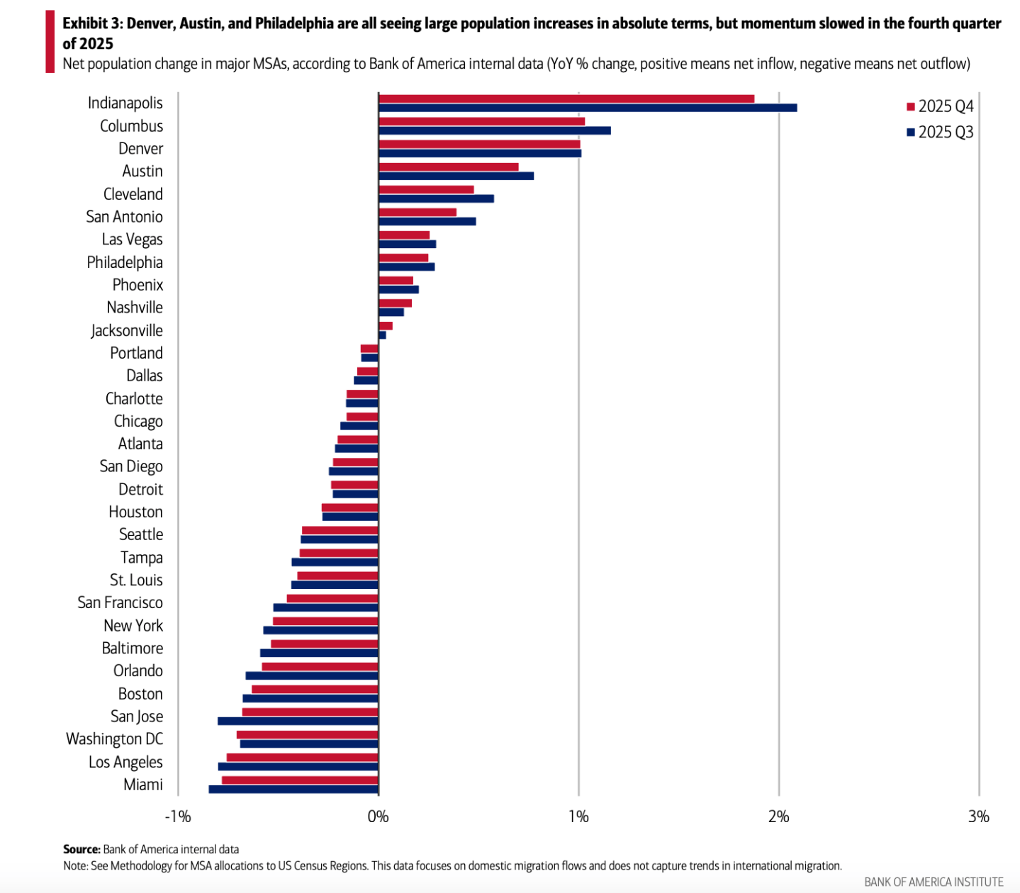 Data from the fourth quarter of 2025 reveals that Miami and Los Angeles topped the list of major U.S. cities suffering the largest population losses in absolute terms; they also had the largest population losses year-over year. While the early 2020s saw Florida serve as a primary refuge for remote workers, the tide is turning for its main hub, with Miami recording the steepest year-over-year percentage drop in population among major metropolitan areas tracked by the bank.