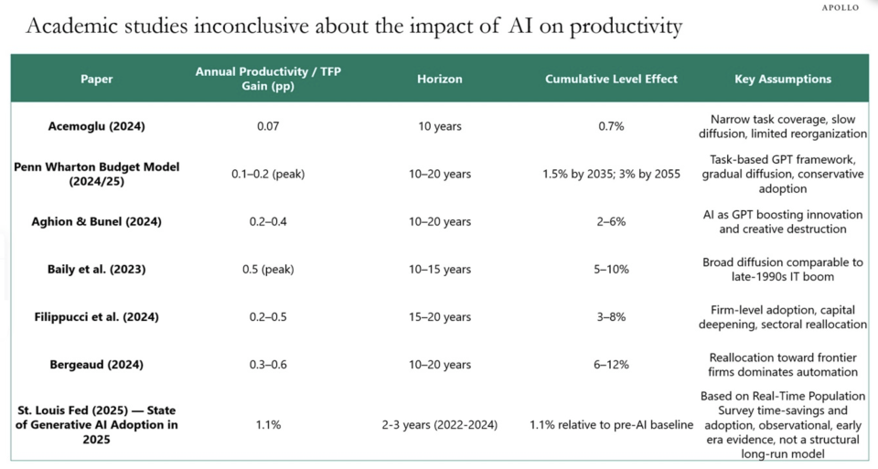 Despite hopes for unlocking a new era soaring growth and abundance, AI has yet to manifest itself clearly in macro data, according to Apollo Chief Economic Torsten Slok.