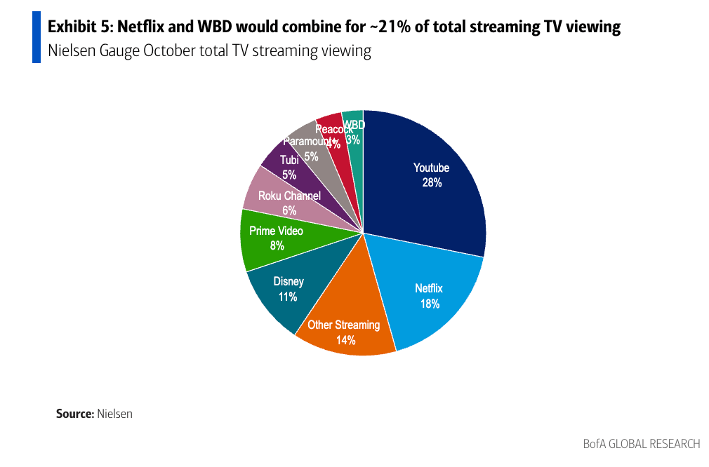 In November 2025, Bank of America Research had also analyzed Nielsen data to calculate that total streaming TV viewing favored YouTube at 28% versus a combined Netflix-Warner at 21%.