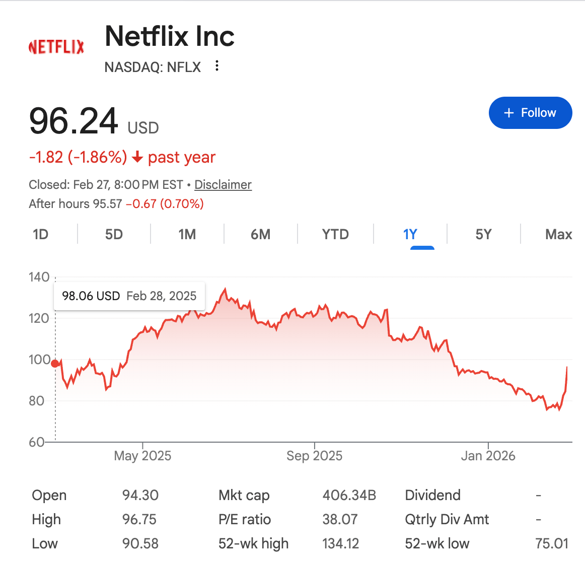 The third unknown is about the rivalry between New York and California. As the bidding escalated, Wall Street traders turned Netflix stock into a live‑fire focus group on how investors feel about a pure‑play tech platform strapping itself to an old‑line studio. Since the Warner bidding began, Netflix shares fell nearly 40%, wiping out over $100 billion in value at one point, as investors modeled a future in which Netflix suddenly owned soundstages and the cyclical economics of theatrical releases.