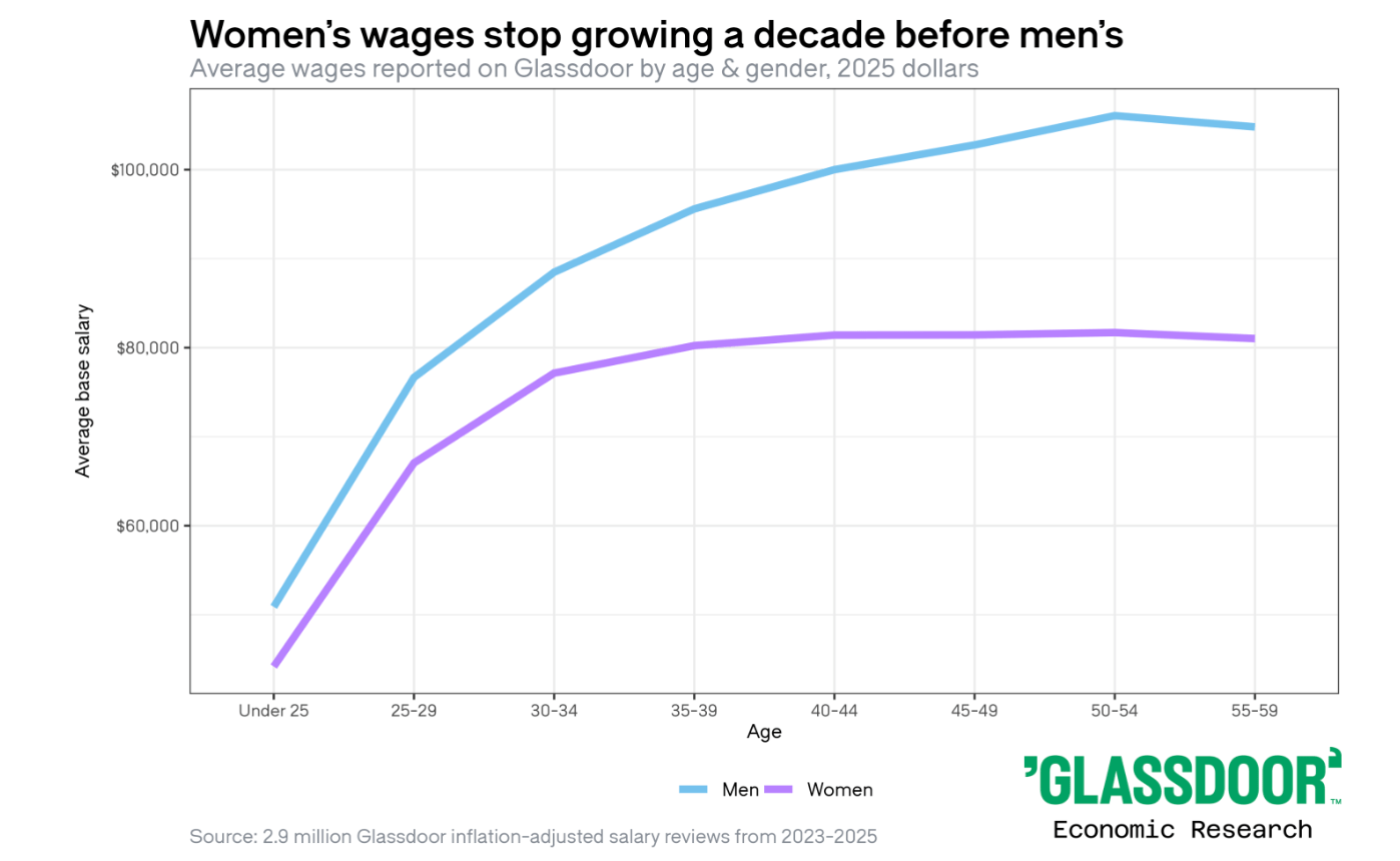 A new analysis of millions of Glassdoor salary reviews, published this week in the platform’s Beyond the Gap: Women’s 2026 Compensation Report, reveals a labor market truth that is both well-documented and still somehow underreported or taken for granted: women’s wages stop growing roughly a decade before men’s.