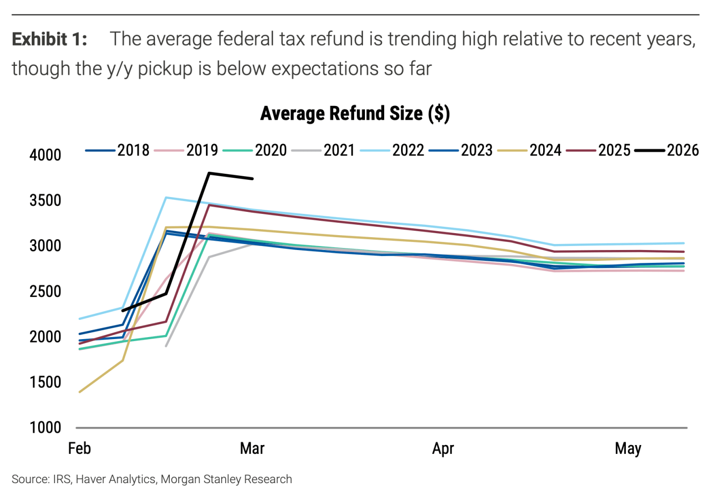 As of March 5, total federal tax refunds were $141 billion, up 9% from the previous year, according to Heather Berger and her colleagues at Morgan Stanley. The average refund is $3,742, up 11%. “This is below our expectation of a 15-25% y/y increase,” the analysts said.