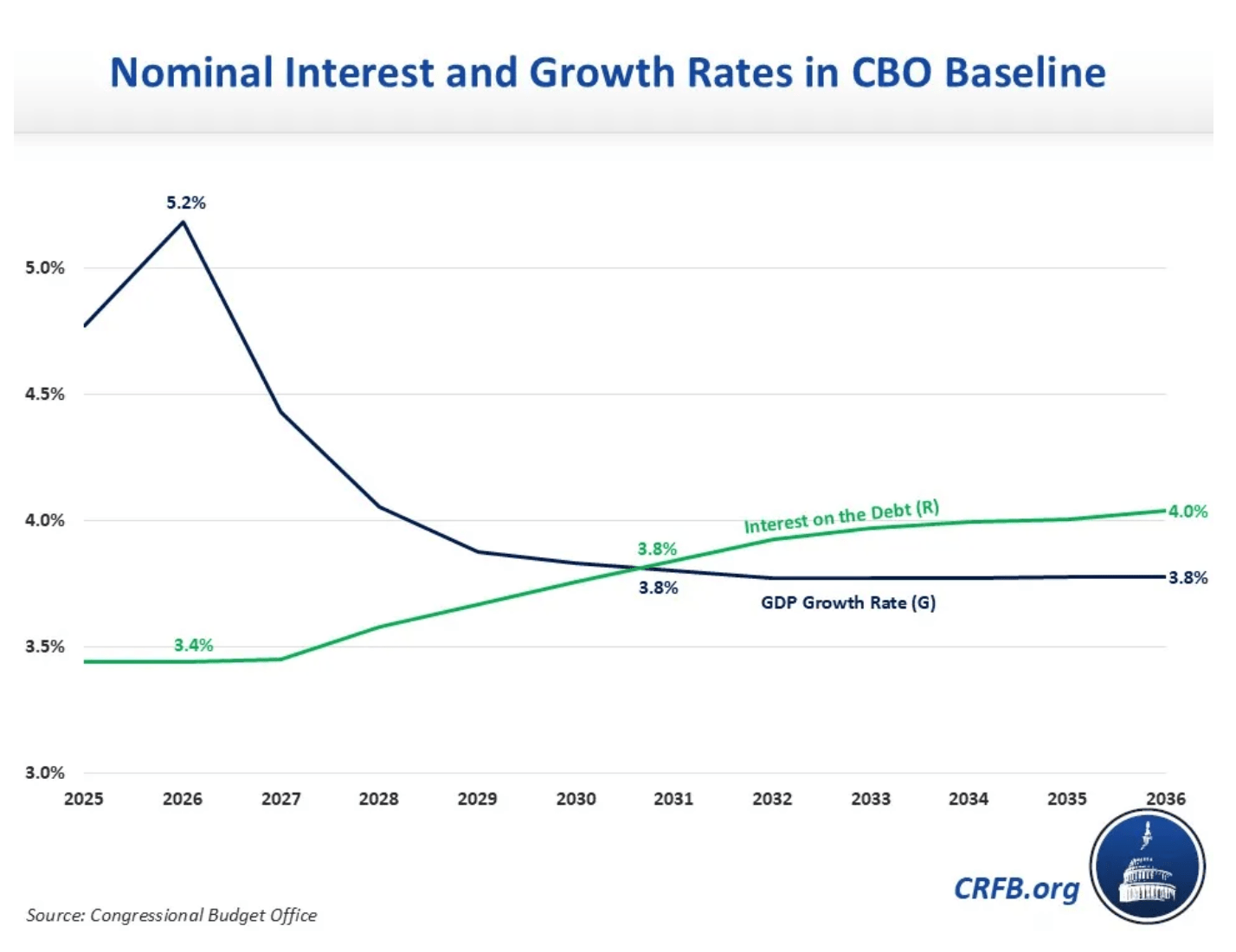 Since 2023, most newly issued Treasury debt has carried yields between 4% and 5%—rates that exceed the economy’s long-term expected growth rate. As older, cheaper debt matures and gets rolled over at these higher rates, the average interest cost on the entire federal debt stock is creeping upward. CBO now projects that by 2031, both R and G will hit roughly 3.8% nominally—and then diverge, with R pulling ahead.