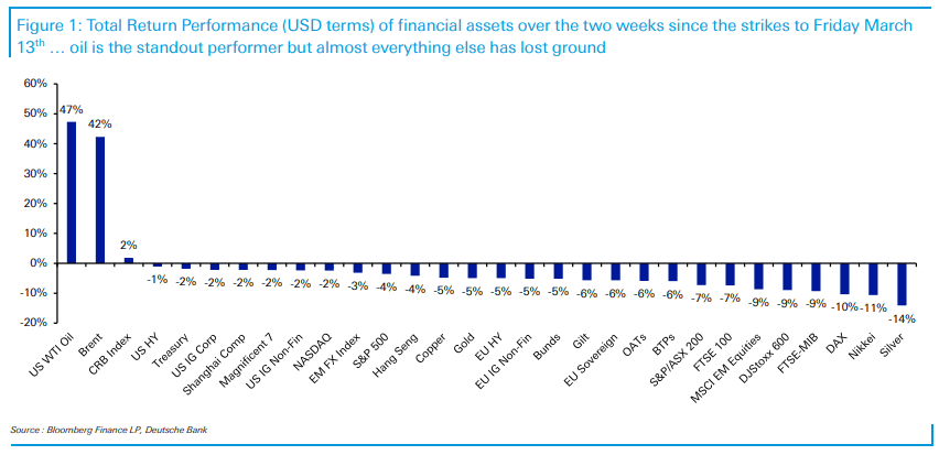 The performance of financial assets in U.S. dollars since the war began through Friday March 13th. Oil (and commodities linked to oil) went up but everything else declined. Chart via Deutsche Bank.
