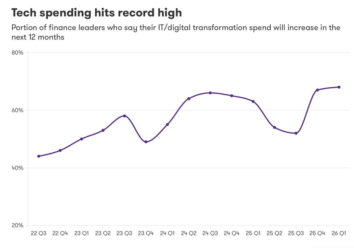 Another key finding is that nearly three-quarters (72%) expect net profit to increase over the next 12 months, up from 68% last quarter. However, more than half (54%) of finance leaders expect ongoing challenges attracting and retaining talent over the next six months. Outsourcing is emerging as a key strategy to address those gaps.