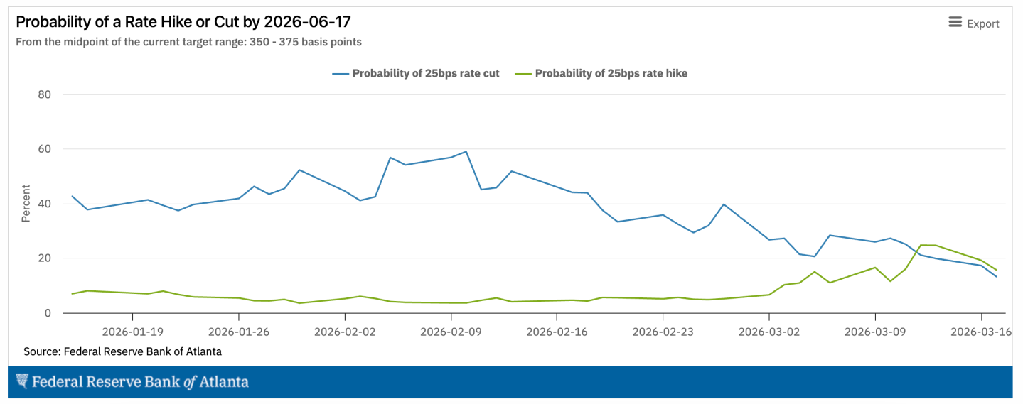 The Atlanta Federal Reserve Bank’s Market Probability Tracker now positions the odds of a rate hike as more likely than the odds of a rate cut within the next three months. The tracker—a tool that estimates the market-implied probabilities of various ranges for the three-month average Fed funds rate—reveals the probability of a rate cut within a three-month window has fallen from a high of about 60% in early February, down to about a 16% chance as of Tuesday. The probability of a rate hike, on the other hand, has risen steadily since the start of the month, up to about 15% from single digits, though down slightly from a high of about 25% last week.