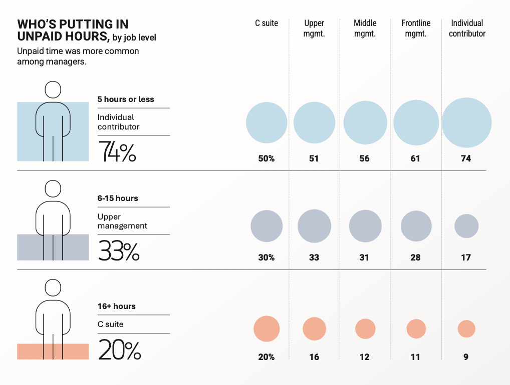 The creeping, unpaid extension of the workday isn’t helping with this angst over productivity. Sixty-two percent of global workers said they put in up to five hours of unpaid work per week, while 38% reported working off the clock for six hours or more. Twelve percent—disproportionately executives and upper managers—said they work without pay for 16 hours or more weekly.