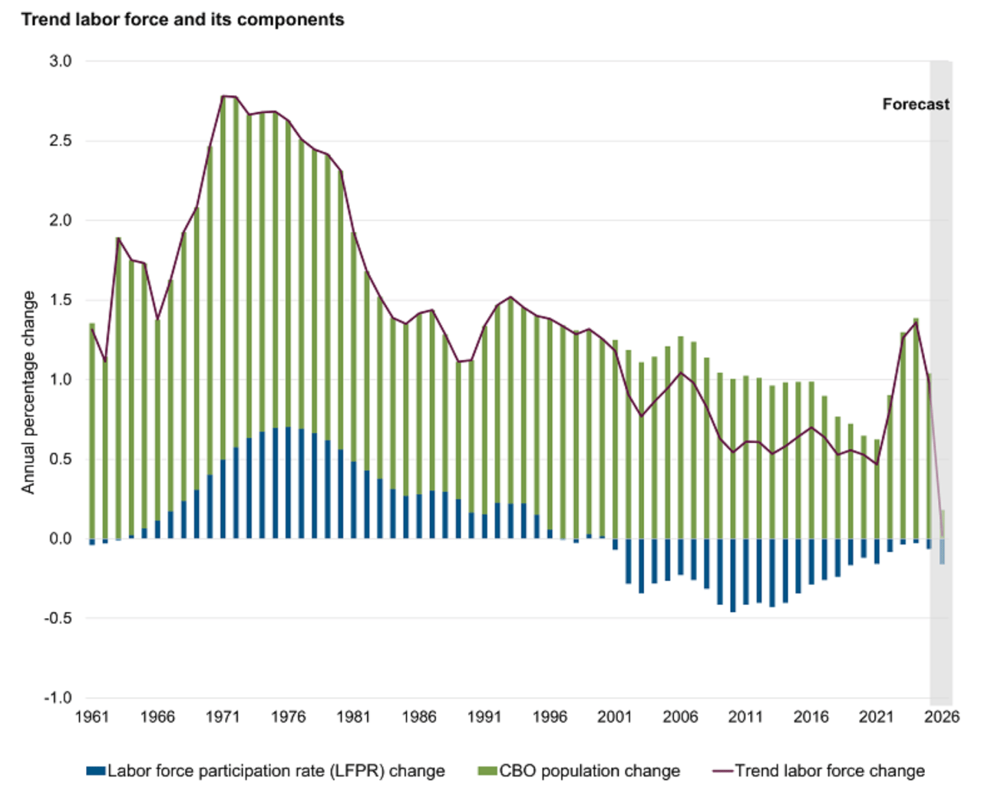 “More restrictive U.S. immigration policies along with long-running demographic trends are reducing labor supply growth and employment trends essentially to zero. This means that the U.S. economy now relies solely on real productivity growth to maintain its 1.5% to 2% trend in overall GDP growth—an unprecedented dynamic.”
