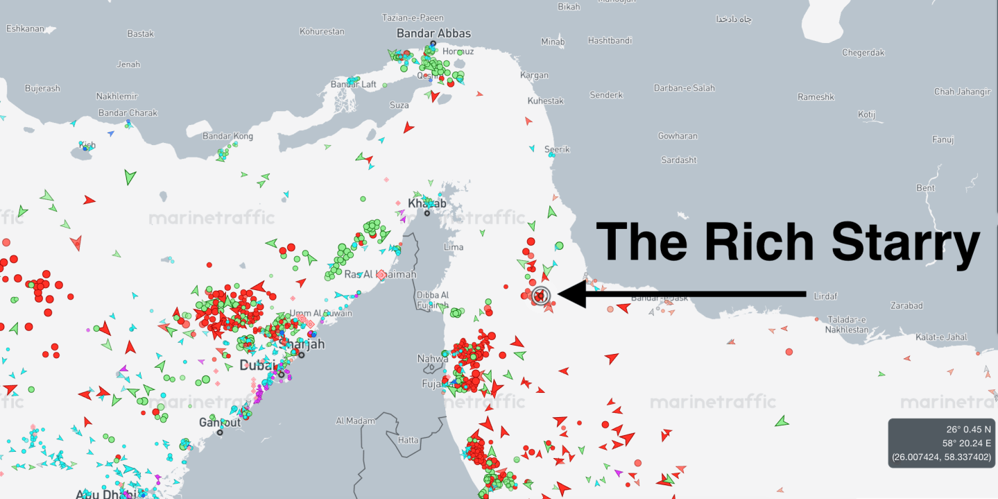 A sanctioned oil tanker, the Rich Starry, appears to have successfully sailed through the Strait of Hormuz, testing the U.S. blockade of the oil export route. You can follow the ship’s progress via the MarineTraffic.com live tracker here. The Rich Starry has gotten through the narrowest part of the strait and appears to be headed south to Sohar in Oman. “Shipowners, energy traders, and investors across financial markets have been keenly following its route,” Bloomberg reports, to see whether the U.S. Navy will block it or board it.