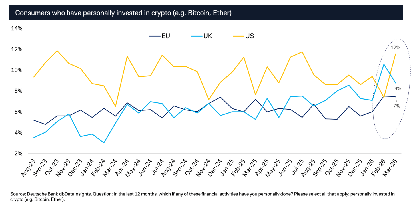 As the price of Bitcoin tanked late last year and in January, the percentage of consumers using it fell, according to research by Deutsche Bank’s Marion Laboure and Camilla Siazon. But recently, adoption rates have ticked up again.
