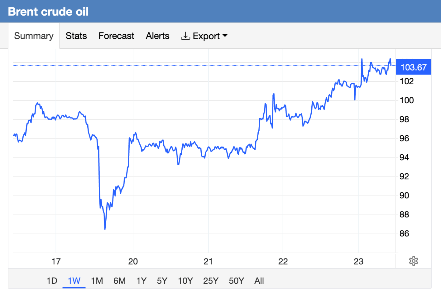 - Brent crude was above $103 this morning. That’s up from its recent low of $85 on April 17, per TradingEconomics.com:
