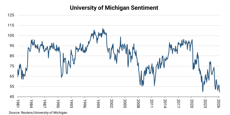 The University of Michigan's current gauge of consumer sentiment. “The index remains at a record low, 0.2 index points below the 50.0 reading in June 2022,” according to Jefferies analyst Thomas Simons: