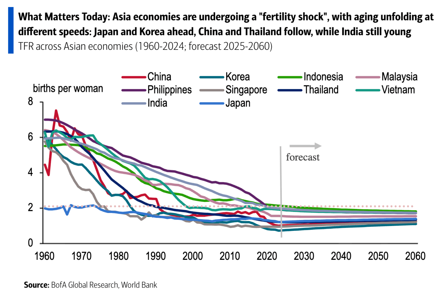 “Asia's average Total Fertility Rate has fallen from around 6.0 births per woman in the 1960s to an estimated 1.87 by 2025, well below the replacement level of 2.1. Japan and Korea are aging fast, followed by China and Thailand, while India and Indonesia continue to benefit from a longer demographic‑dividend window. Demographic aging is widely seen as a drag on potential growth, through reduced labor supply, weaker innovation, and slower productivity gains,” Bank of America’s Yvonne He and Helen Qiao said in a recent research note.