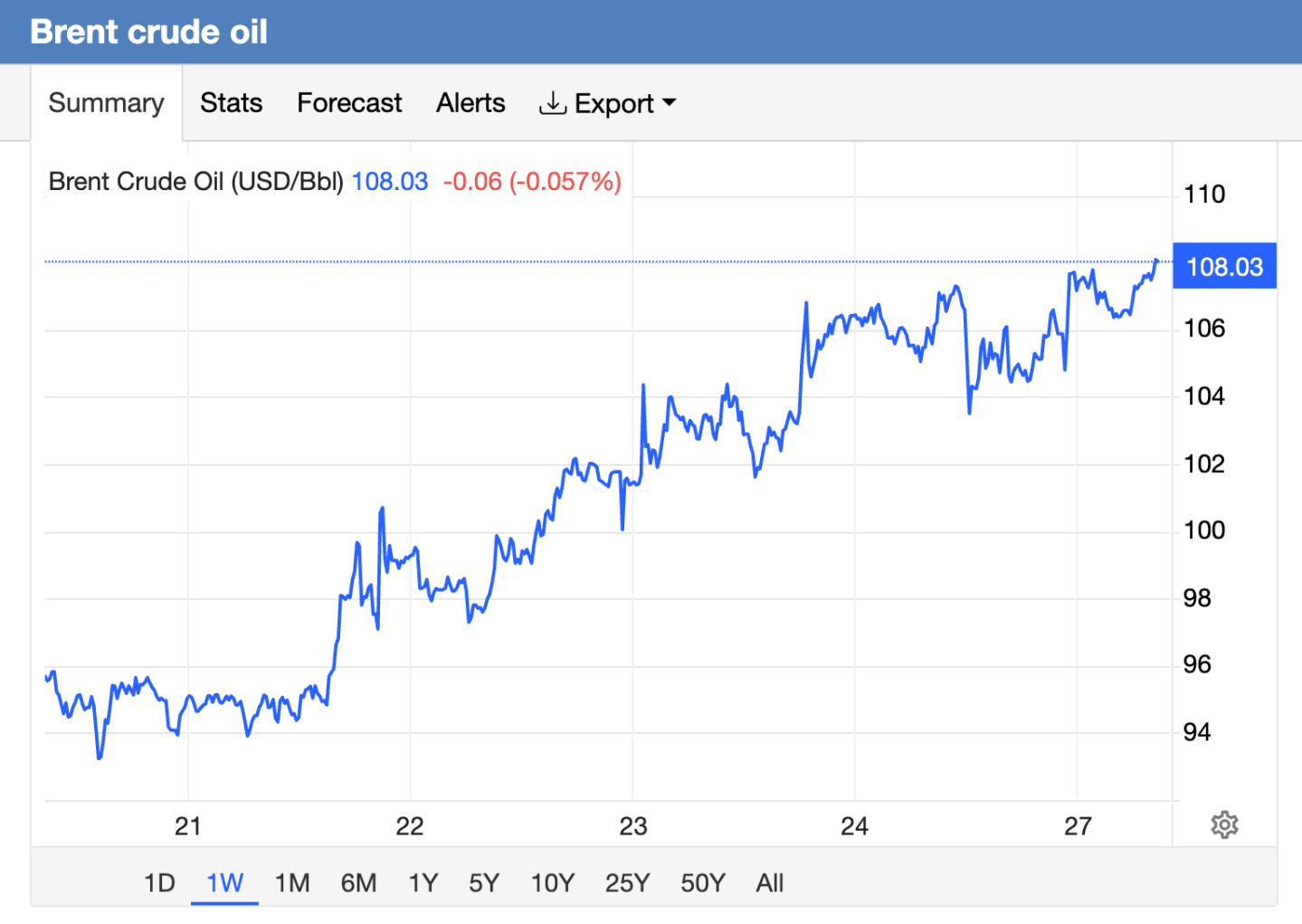 - Brent crude was up to $108 per barrel this morning as the Strait of Hormuz remains closed.