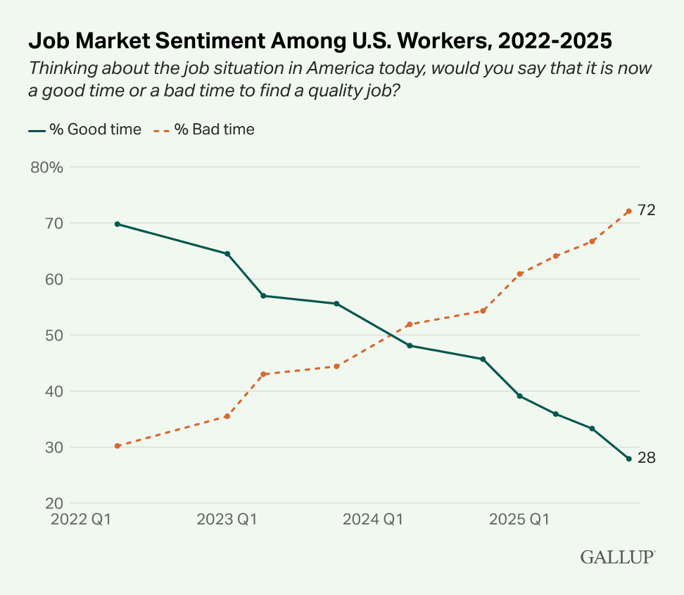 Job market confidence has deteriorated sharply, with the share of U.S. workers who say it is a good time to find a job falling from roughly 70% in 2022 to just 28% more recently. The decline is most pronounced among younger workers and the college-educated, who in a reversal of historical patterns are now more pessimistic than those without degrees—(19% of college graduates say it is a “good time” to find a quality job, versus 35% of those without degrees).