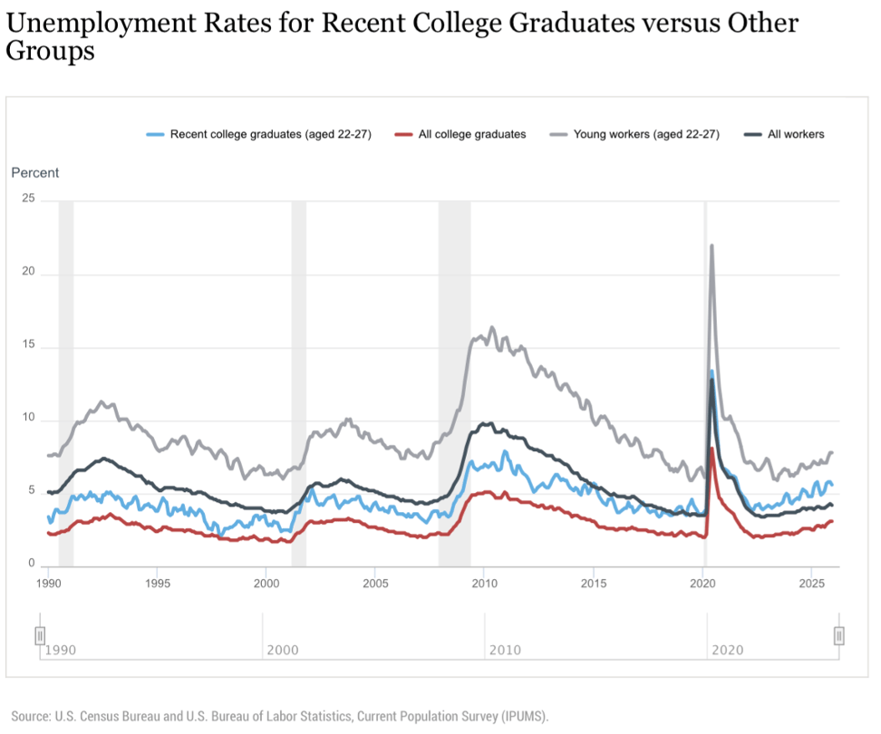 On the surface, the broader labor market also looks fine. Unemployment remains near historic lows, around 4%. But look closer, and the cracks begin to appear: unemployment among recent graduates has climbed to nearly 6%, rising twice as fast as the rest of the workforce since 2022.