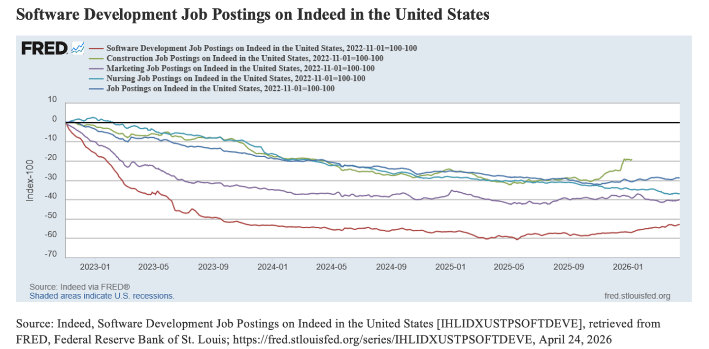 Similar conflicting patterns are emerging across other technical roles. One respected firm publishes a study forecasting mass firings, while another estimates the net effect is minimal. Given all this noise, the average firm has chosen not to lay off workers on a large scale. Instead, many are silently closing the door to new ones.