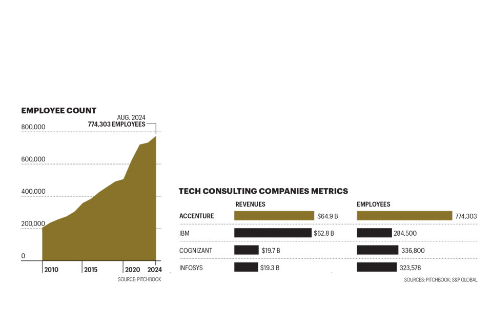 Unlike strategy-focused consulting firms like BCG or McKinsey, which study a client’s business and present suggestions for change, Accenture also takes on operations and services on behalf of its clients, deploying Accenture employees to provide SAP integration, for example, or cybersecurity. (“We’re not delivering just PowerPoints,” Sweet once explained.) Accenture also has rivals in the IT consulting space, but they don’t have the traditional C-suite consulting chops or the same breadth of clients. Accenture is the only consulting company that offers it all at scale.