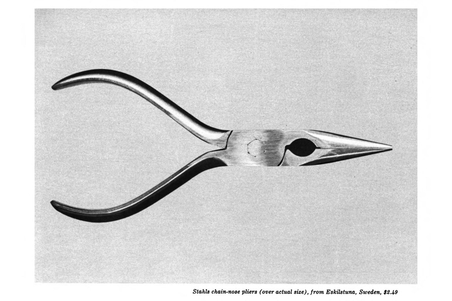 Among low-priced, factory-produced goods, none is so appealing to the senses as the ordinary hand tool. Hence, a hardware store is a kind of offbeat museum show for the man who responds to good, clear “undesigned” forms. The Swedish steel pliers pictured below, with their somehow swanlike flow, and the objects on the following pages, in all their tough simplicity, illustrate this. Aside from their functions—though they are exclusively wedded to function—each of these tools lures the eye to follow its curves and angles, and invites the hand to test its balance.