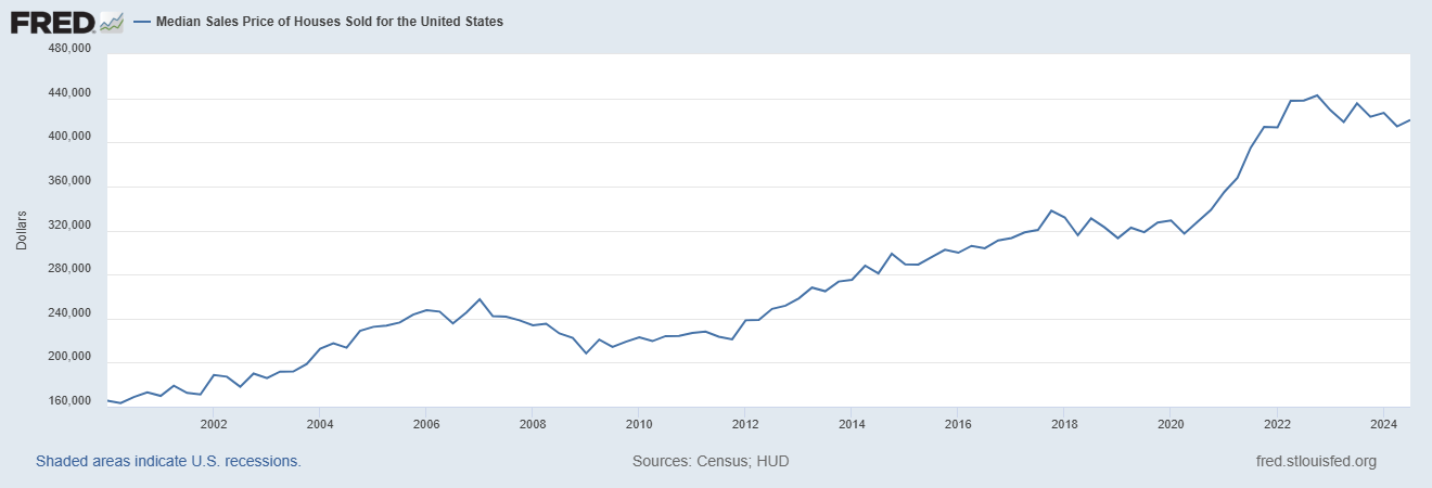 The bulk of U.S. home sales remain below the cap for the capital gains tax exclusion. Data made available by the Federal Reserve Bank of St. Louis on FRED show that as of the third quarter of 2024, the median home sales price was a little over $420,000 and the average home sales price was a little over $500,000.